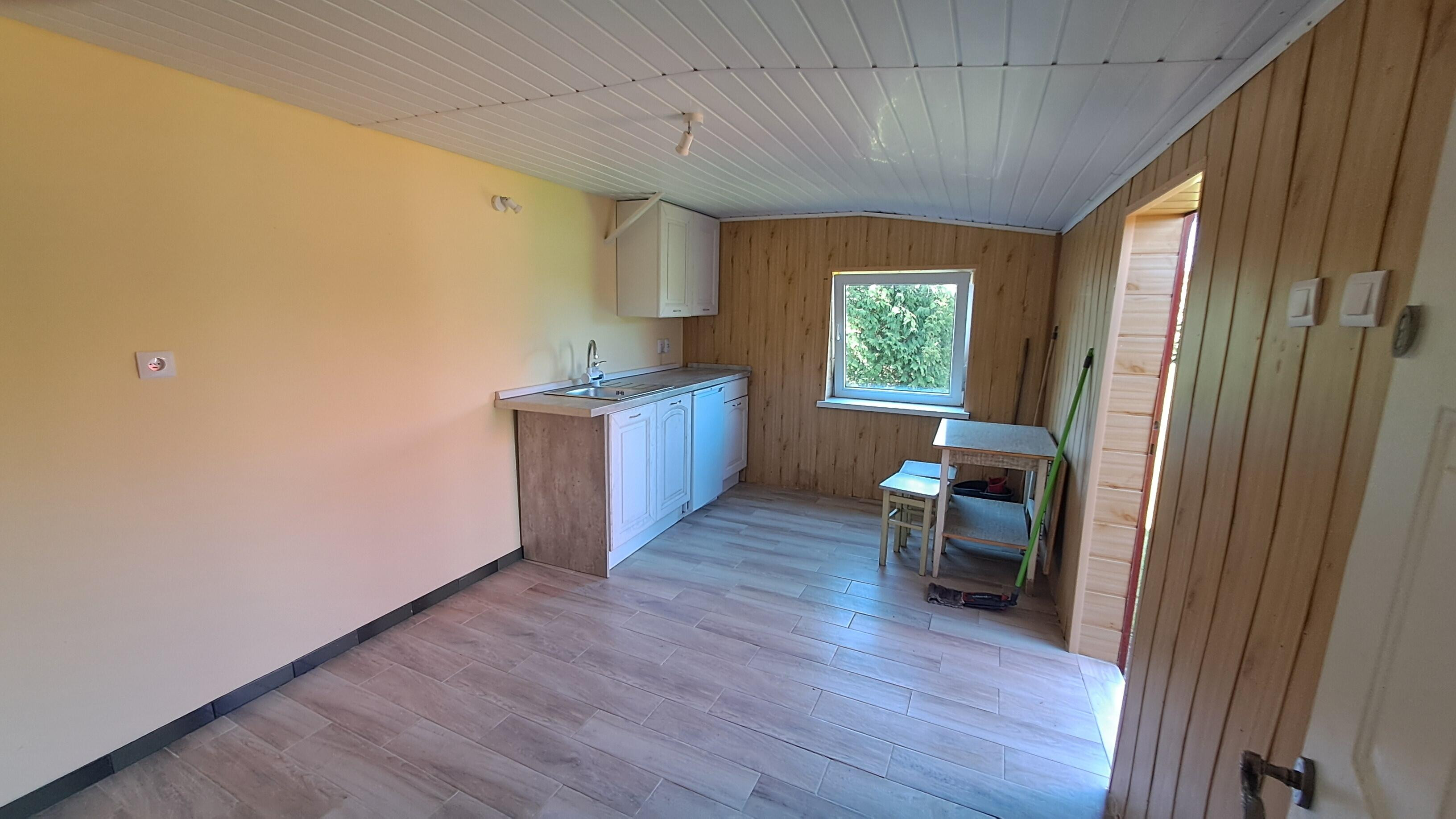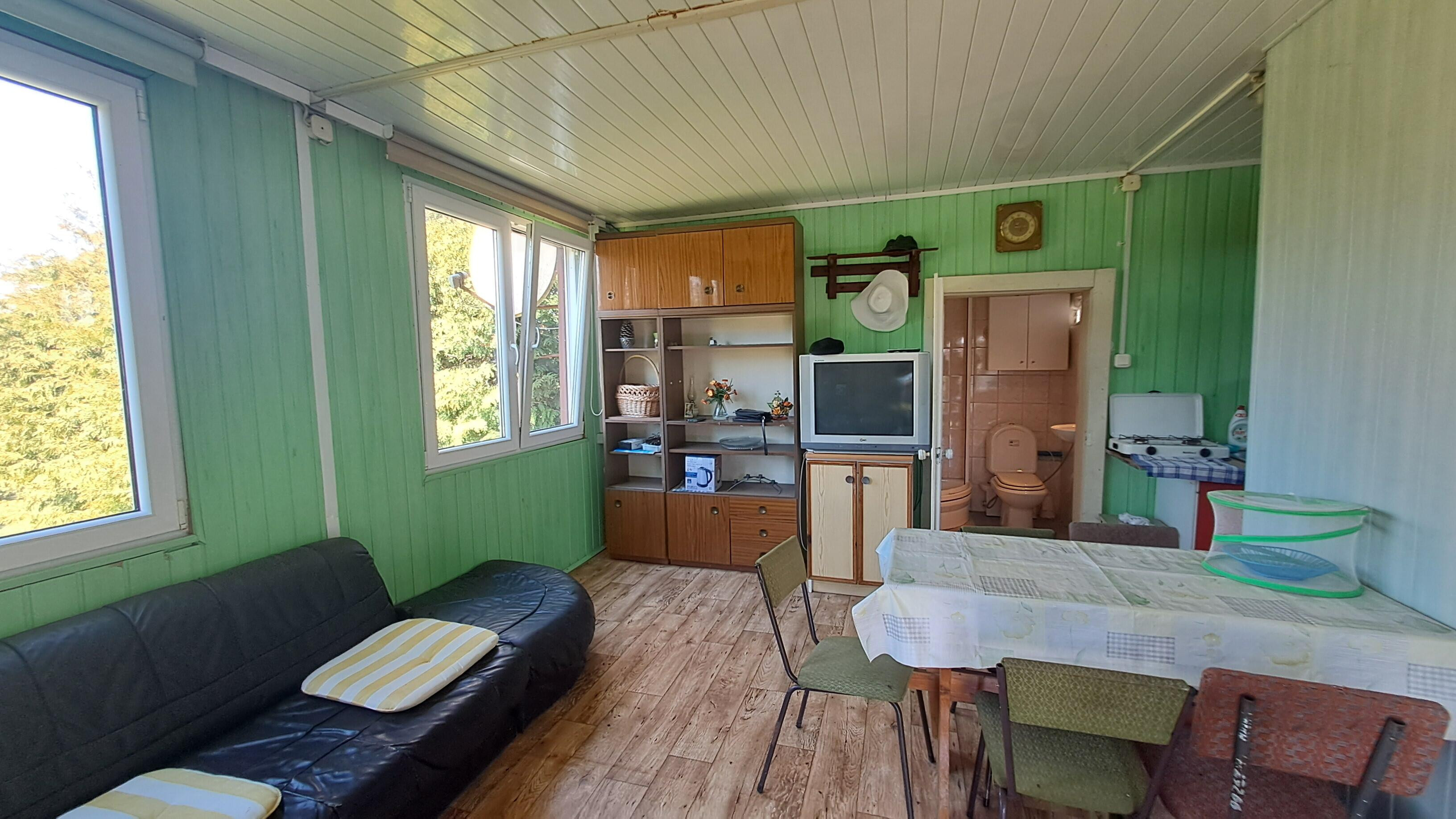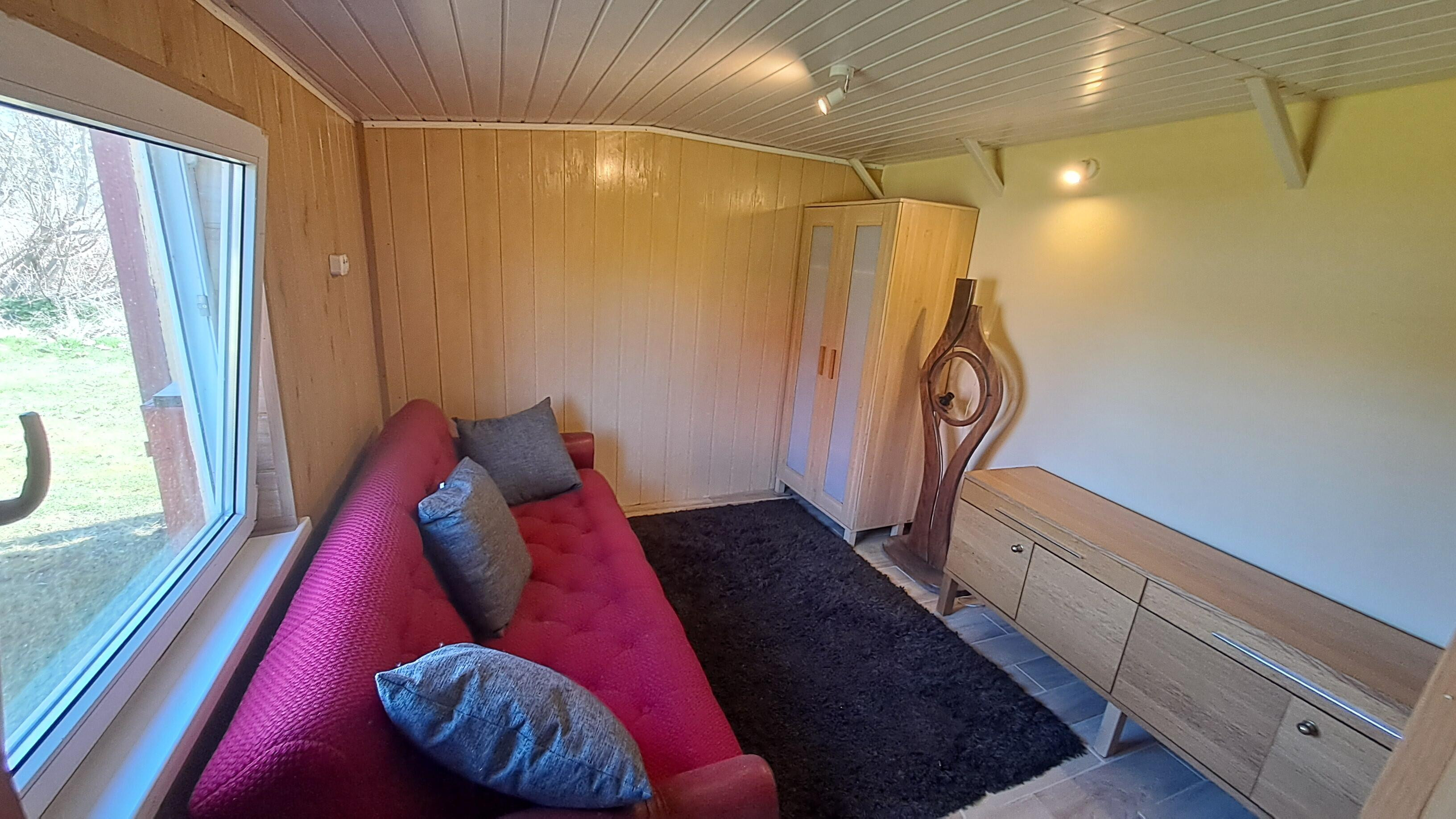 - Pierwszy budynek to przytulny salon z aneksem kuchennym, sypialnia i łazienka oraz poddasze z możliwością spania dla 4 osób. Za budynkiem mały warsztat - pomieszczenie gospodarcze.