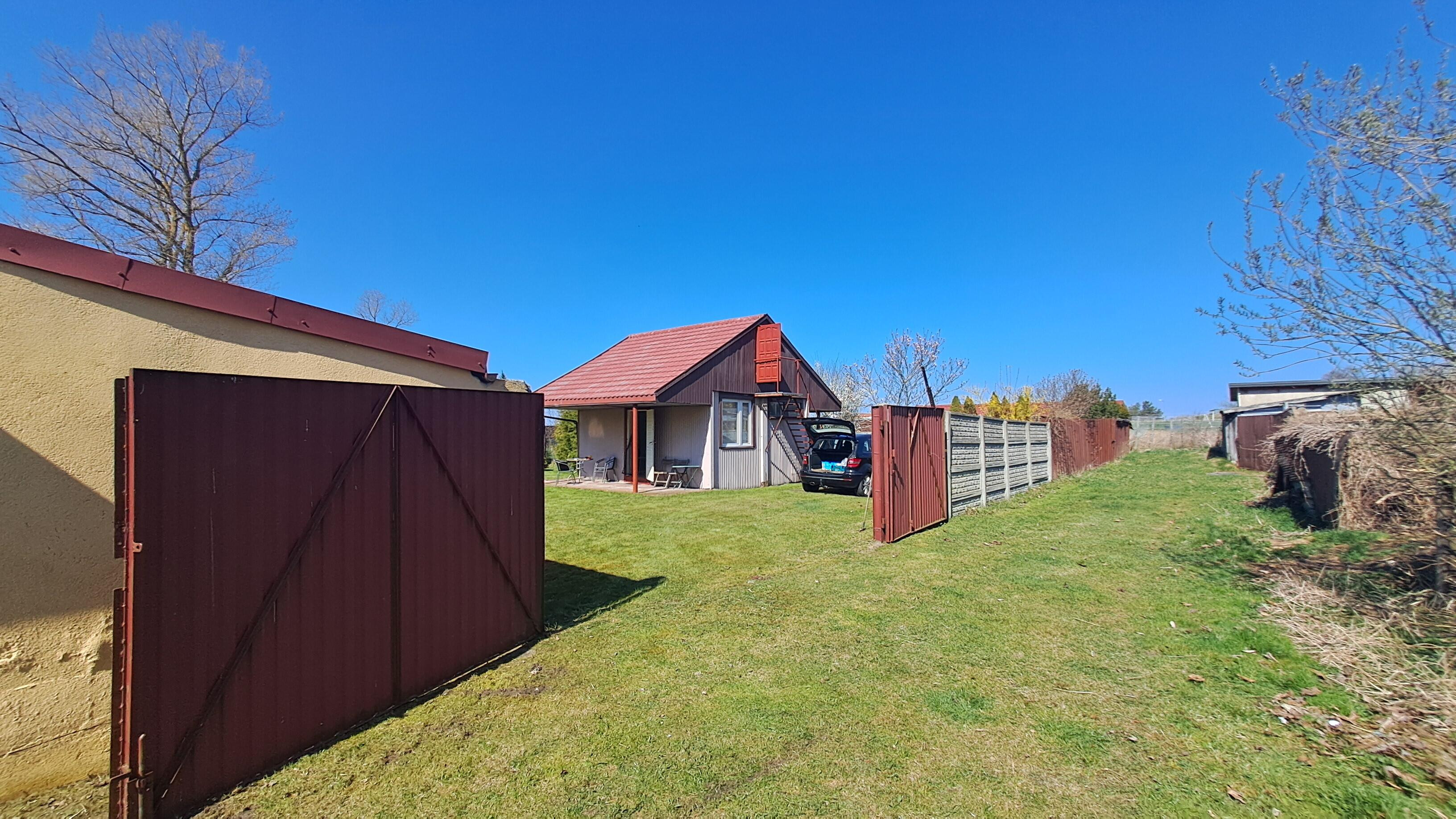 Wjazd na działkę jest zamykany rozsuwaną bramą stalową.
